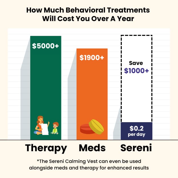 Give your child the support they need while saving thousands! The average family spends over $5,000 a year on weekly therapy sessions. Money you could use for groceries, their education, or even fun family trips. The Sereni Calming Vest is a fraction of that. So no need for endless appointments or recurring fees.